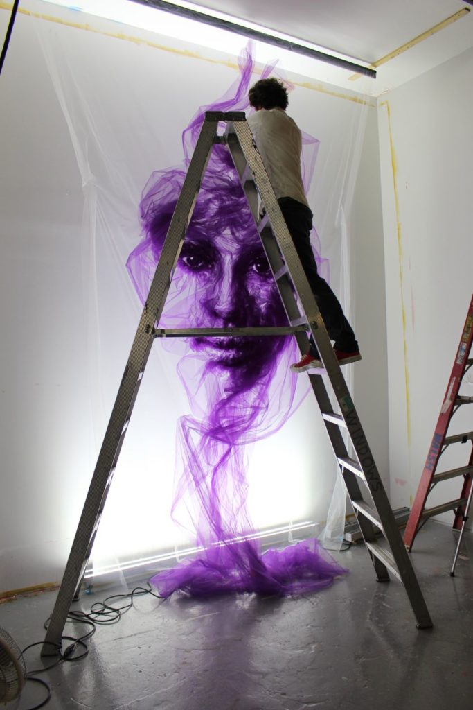 На каждый объект уходило по 15 метров цельного полотна ткани и 50 часов работы! Со стороны все может показаться элементарно, но особенность и сложность работы в том, что нельзя было резать ткань. Все должно было подкалываться булавками. За счет этого каждая полученная складка привносила свой акцент в общую работу.