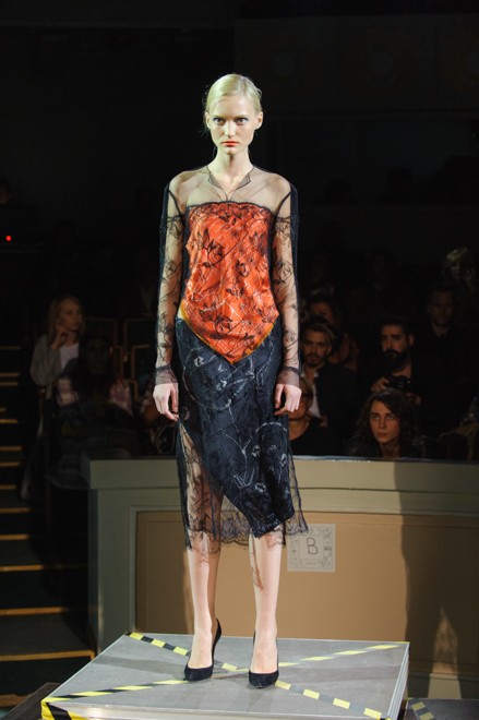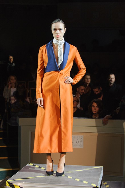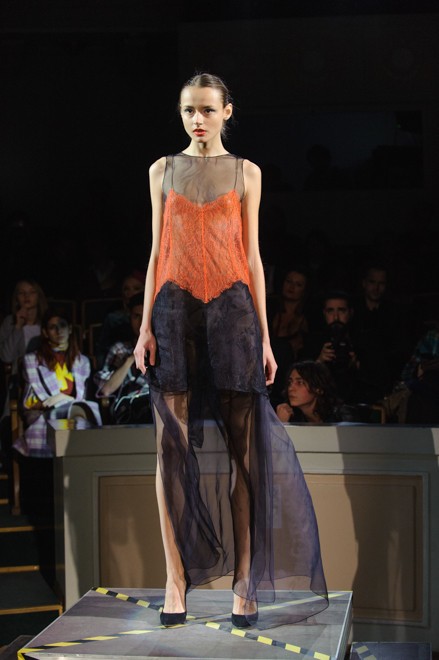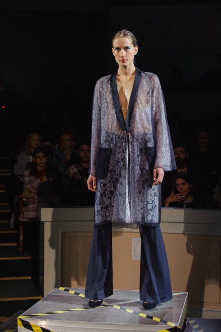 Уходя от стандартных локаций, дизайнер выбирает Киевский Дом учителя в качестве площадки для своего перформанса. В камерном зале показано не просто дефиле, здесь и тет-а-тет глазами, и смешанные чувства, и то самое будоражащее влечение. Расклешенные брюки сочитаются с прозрачными рваными и асимметричными топами, будуарные платья-халаты пересекаются с удлиненными жакетами. Пенюарные истории всплывают в насыщенно оранжевых, металически синих, изумрудных и бежевых красках, оставляя место белому и черному, невесомому и всячески неприкрытому. Бархат, атлас, кружева – ткани, тактильные ощущения от которых незабываемы.