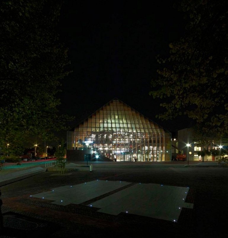 Благодаря стеклянному фасаду здание пирамиды видно со всех сторон. А яркая подсветка – задумка дизайнеров, которая словно приглашает всех желающих на чтение, привлекая гостей города. Библиотека играет важную роль в жизни местного сообщества. Кроме книг, в «пирамиде» находятся экологический образовательный центр, конференц-залы, шахматный клуб, магазины и офисы. Залы же библиотек расположены я в области террас для максимального использования света и пространства.