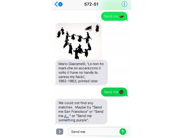 Музей современного искусства Сан-Франциско запустил специального СМС-бота, который будет общаться с помощью картин! Проект получил название Send Me. Чтобы начать общение необходимо отправить на номер 572-51 запрос с фразой «send me» и ключевое слово с эмоцией, цветом, настроением.