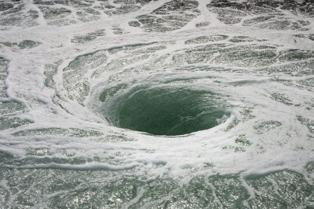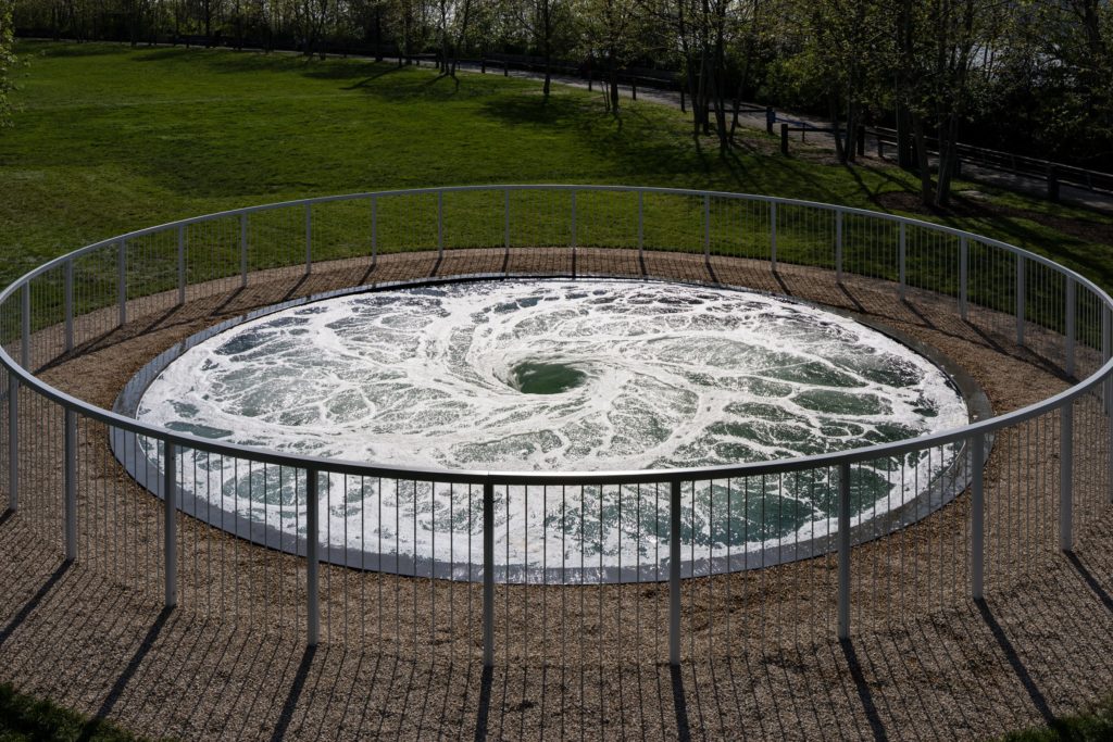 Бесконечно вращающаяся работа британско-индийского скульптора представляет собой бассейн, в котором вода все время движется по спирали. Работа вызывает восторг и ужас, так как воронка, затягивая и закручивая воду, уносит ее словно в бездну и все действительно выглядит как настоящий водоворот. Бассейн, диаметр, которого составляет 8 метров, огражден, чтобы люди могли заглянуть в него, но при этом не упасть.