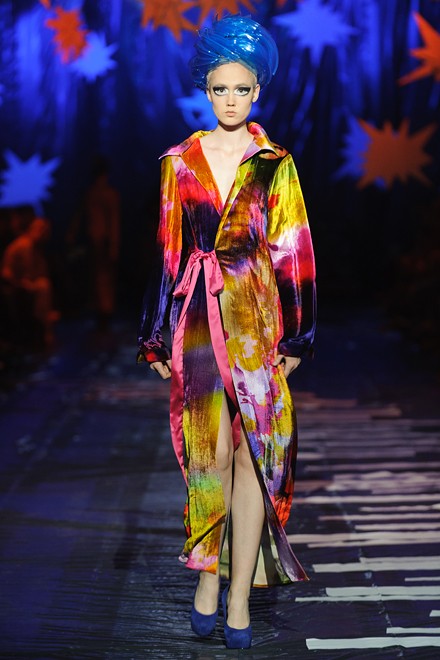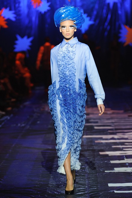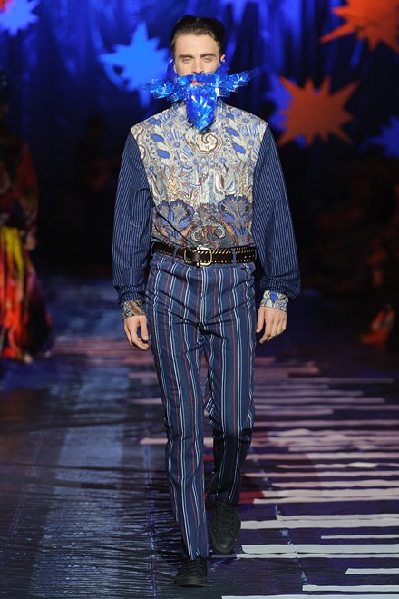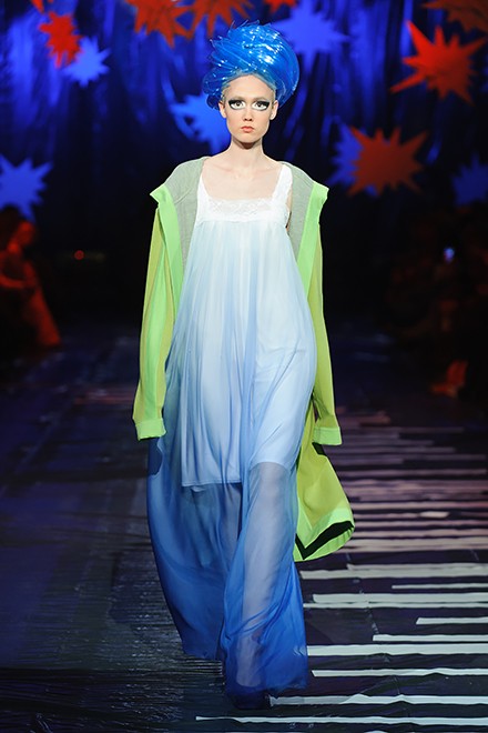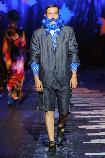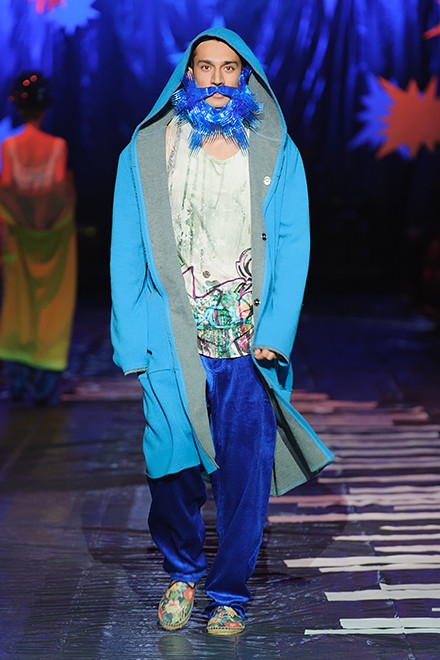 Основной цвет коллекции – ультрамарин – дополняется тоновыми растяжками, нежно-зеленым и контрастно-желтым. Доминируют удлиненные формы по фигуре, без навязчивой многослойности (притом здесь она больше мужская, чем женская), силуэты четко оформлены, и даже можно было бы заподозрить дизайнера в излишней строгости, но пластиковые прически и бороды перечеркивают подозрение напрочь, внося фривольность и элемент игры.