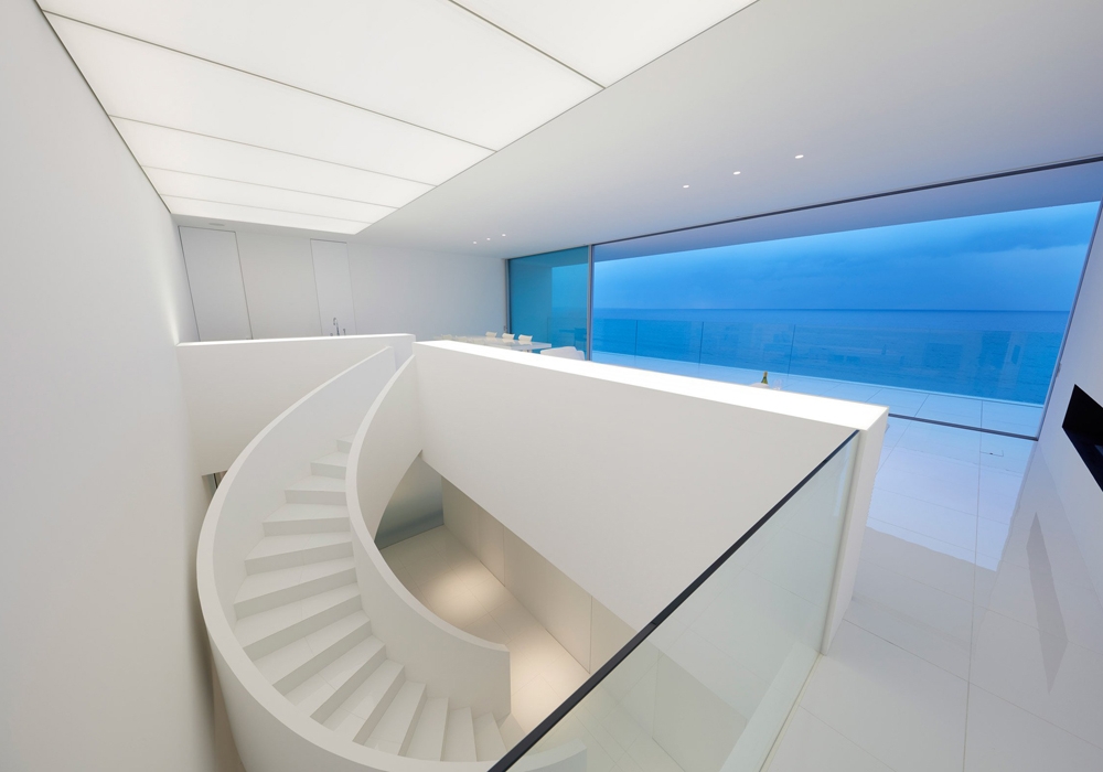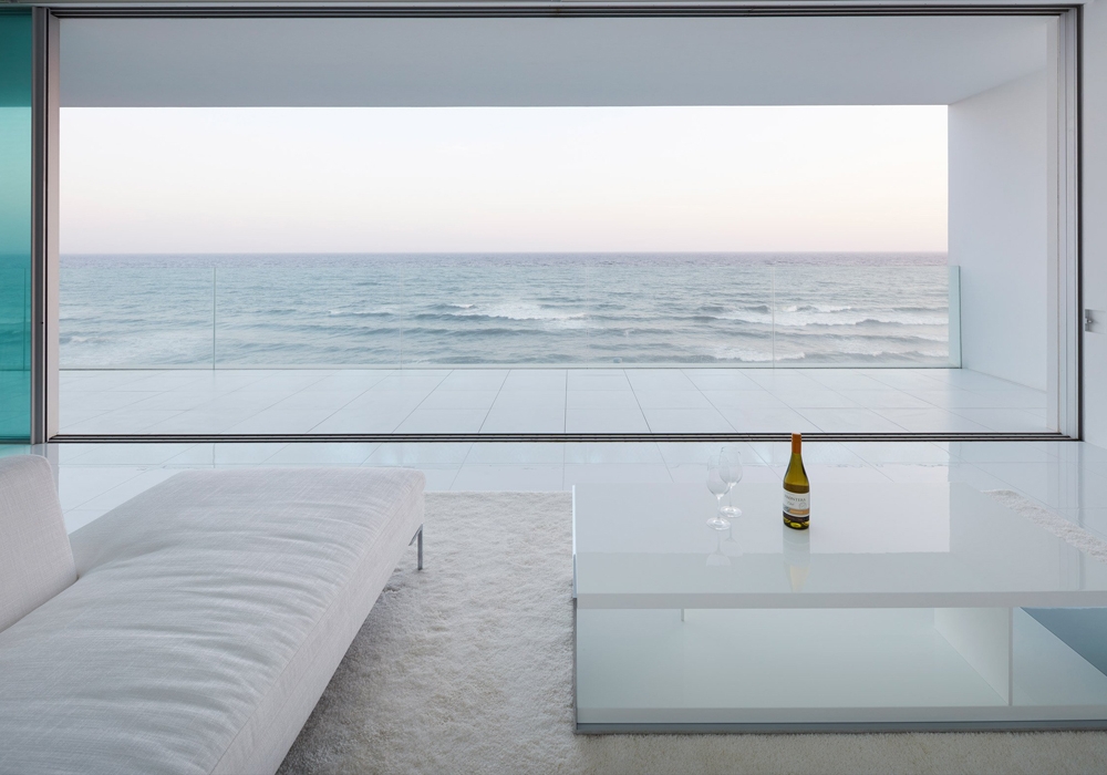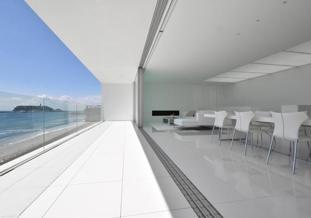 Дом возведен из белоснежного бетона и той стороной, где расположен бассейн и веранда выходит на побережье Тихого океана. Проект веранды с бассейном создан так, что на нависает над односторонней железной дорогой. Эта часть дома устроена таким образом, что бассейн кажется безграничным и словно сливается с океаном и небом.